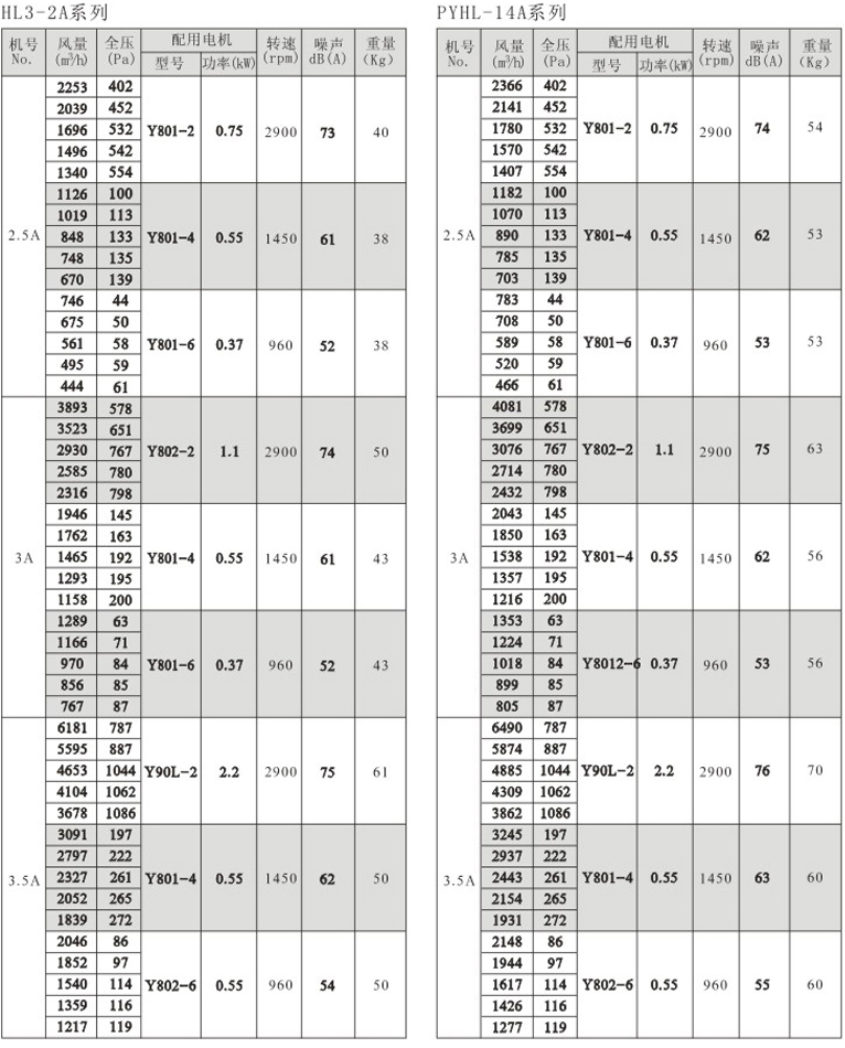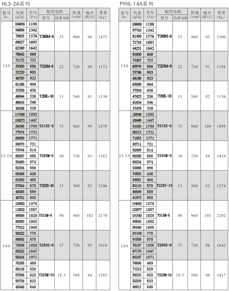 HL3-2A系列混流风机,PYHL-14A系列混流排烟风机性能参数表(1)