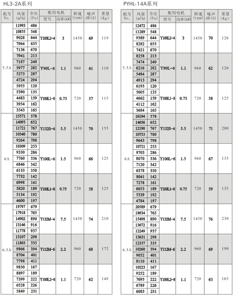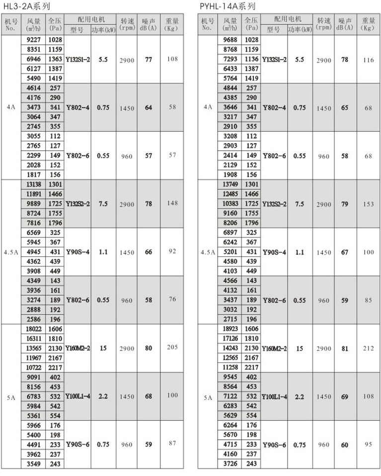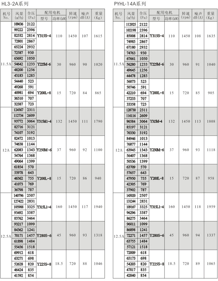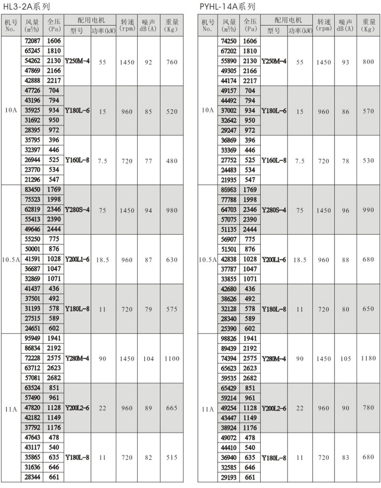 HL3-2A系列混流风机,PYHL-14A系列混流排烟风机性能参数表(5)