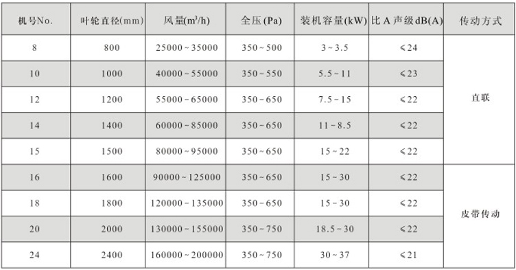 该系列风机机号分为8-24#九种规格,多种品种,风量由2.5万m3/h-20万m3/h-,风压350-750Pa,用户可根据性能参数表或实际使用情况进行选择。
