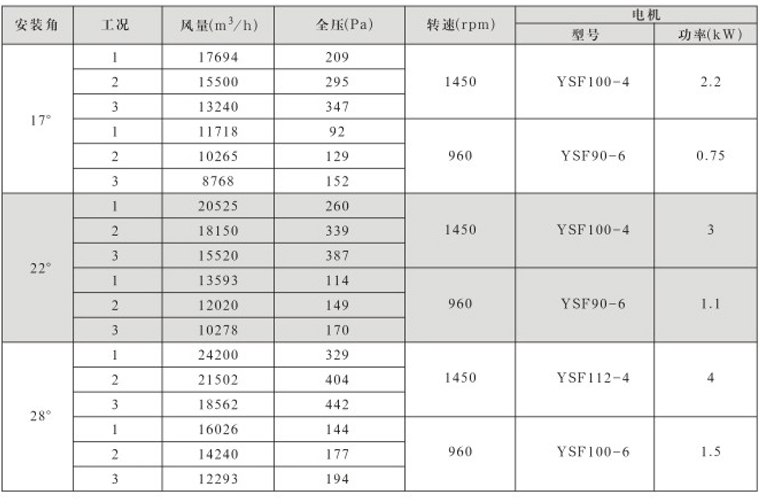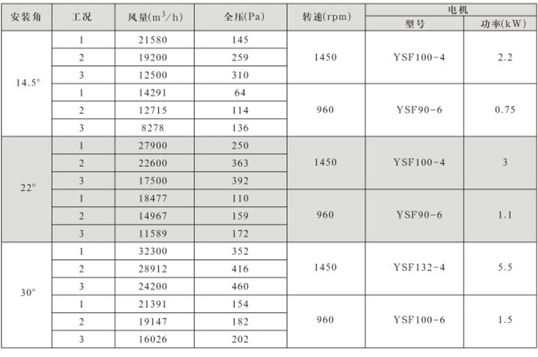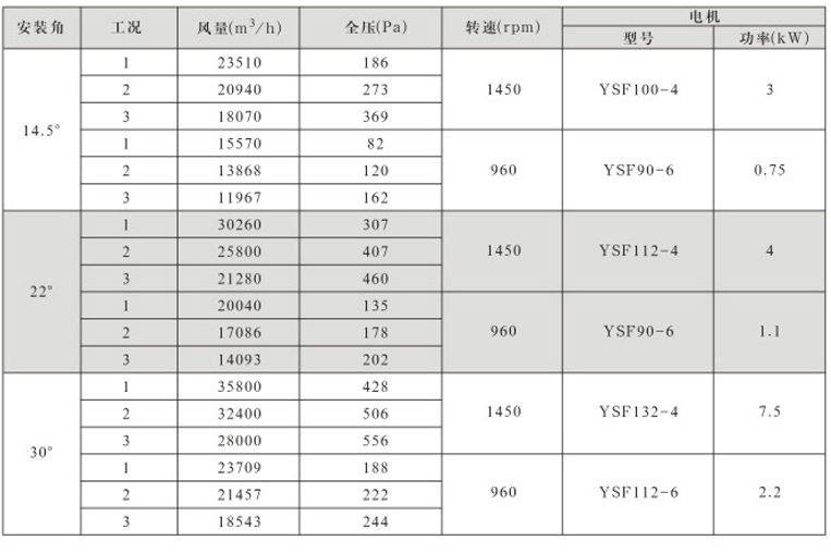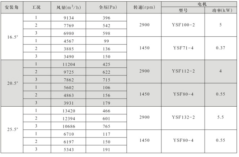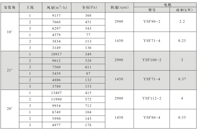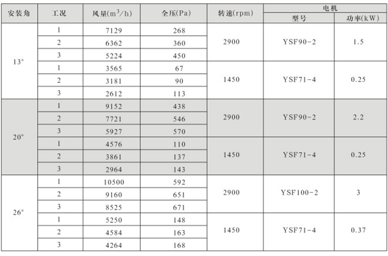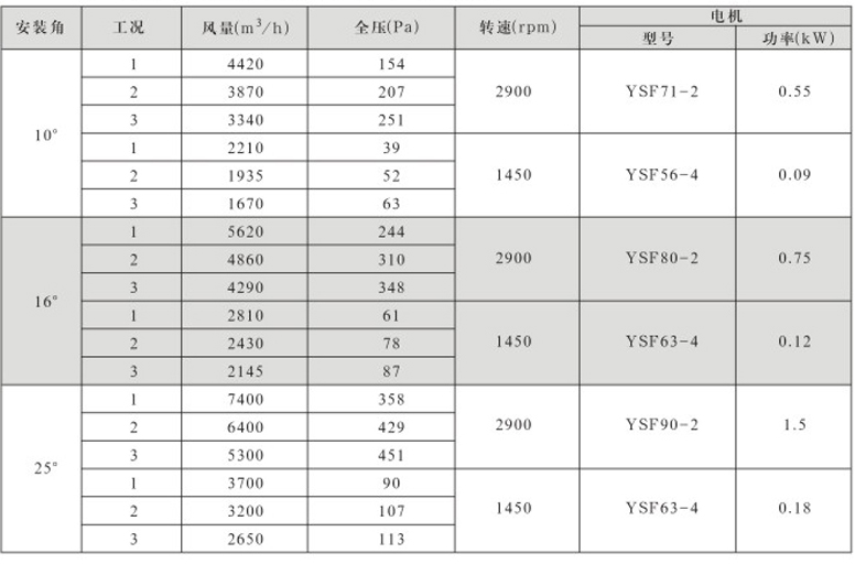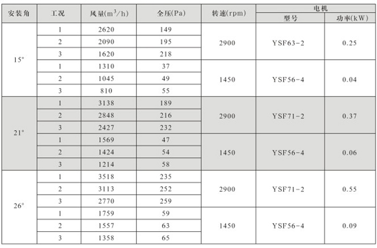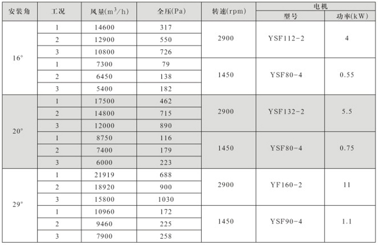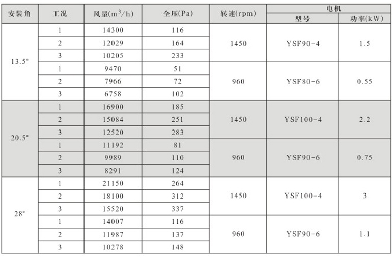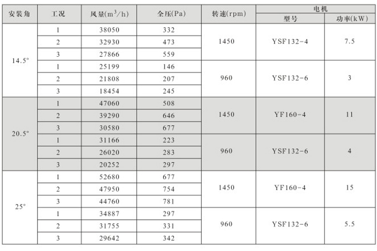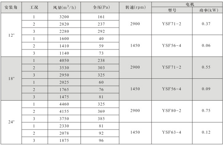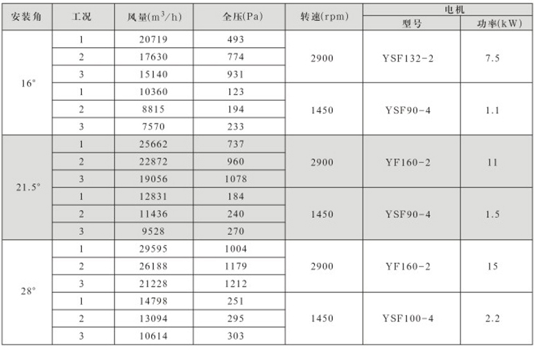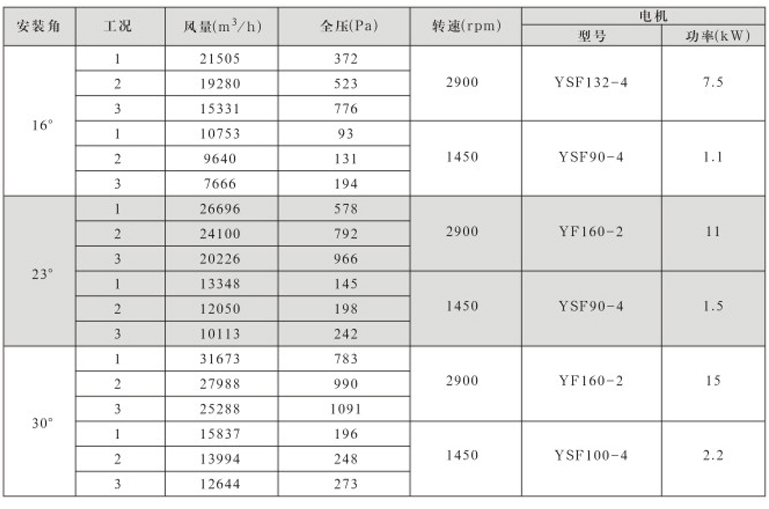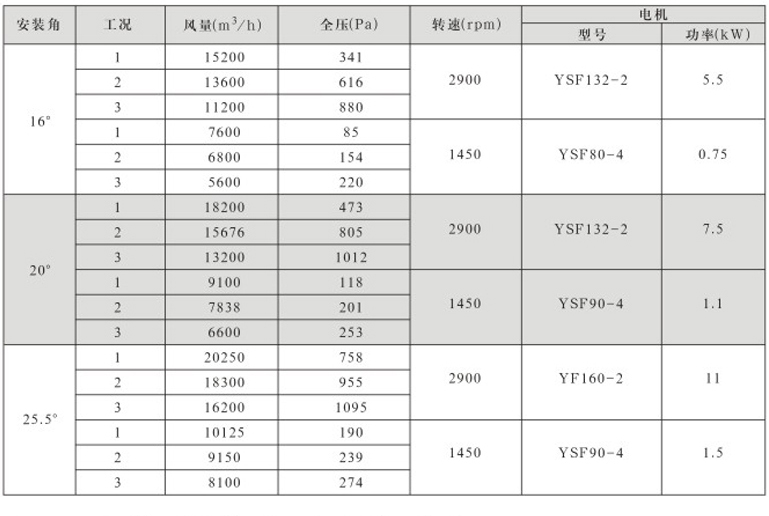风机固定叶角,静、动态可调叶角:固定叶轮是指叶轮与叶片固定;静态可调是指停机后,拧松叶柄螺栓,人工调节叶片角度;动态可调是指风机运行状态下按使用工况要求任意调节叶片角度,并可以根据温度和湿度要求进行自动控制调节叶片角度;