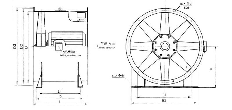 风机配套电机:采用IP55(IP54)防护等级、H(F)级绝缘,湿热性电机,其电机配套轴承采用SKF电机末端全封闭式。接线盒安装在风机外壳。